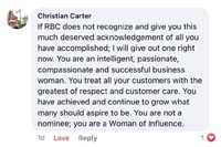 "If RBC does not recognize and give you this much deserved acknowledgement of all you have accomplished; I will give out one right now. You are an intelligent, passionate, compassionate and successful business woman. You treat all your customers with the greatest of respect and customer care. You have achieved and continue to grow what many should aspire to be. You are not a nominee; you are a Woman of Influence."